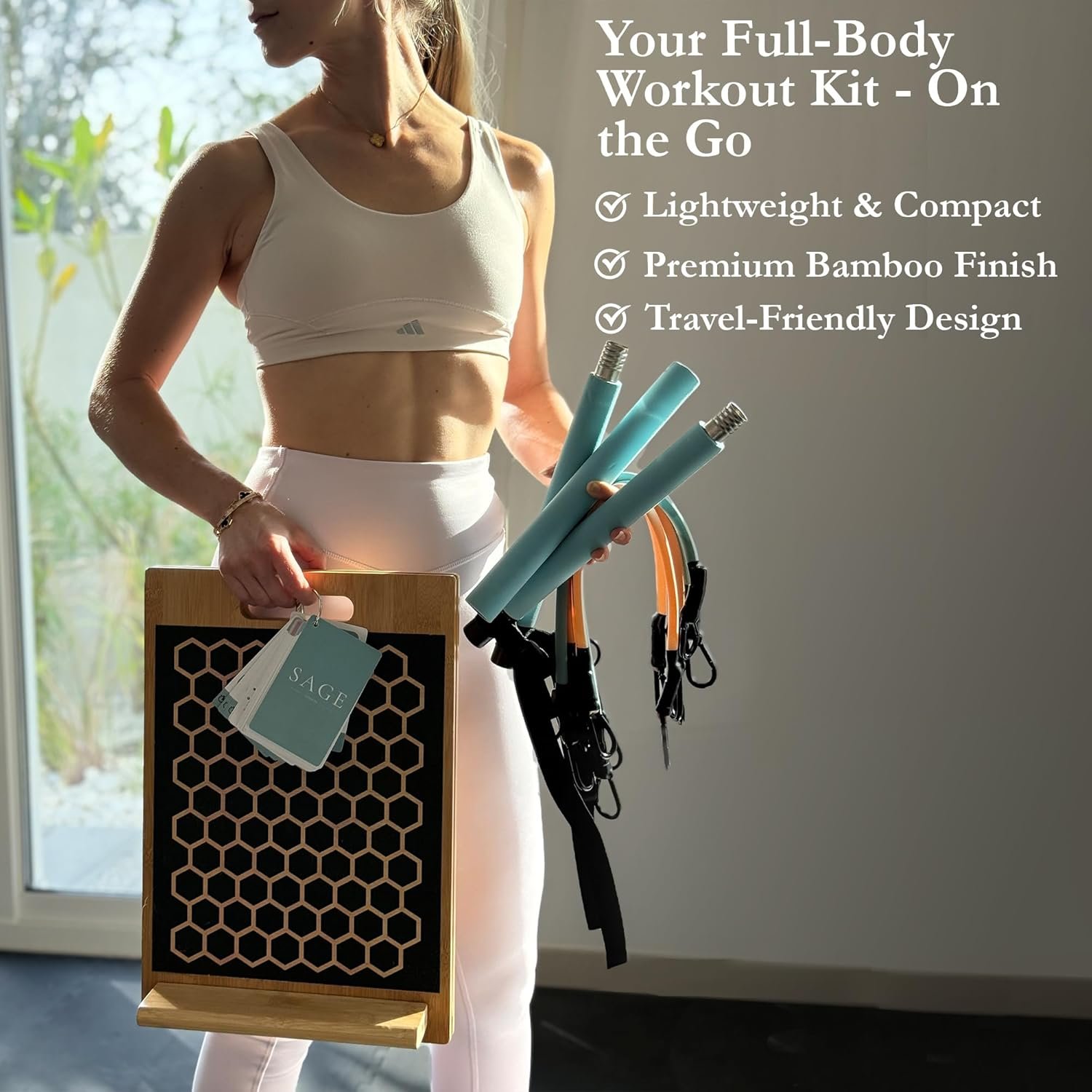 ☽ 𝐘𝐨𝐮𝐫 𝐀𝐥𝐥-𝐢𝐧-𝐎𝐧𝐞 𝐇𝐨𝐦𝐞 𝐖𝐨𝐫𝐤𝐨𝐮𝐭 𝐊𝐢𝐭: Experience full-body workouts with Sage London’s elegant 3-in-1 Pilates kit for home workouts – featuring a bamboo slant board, Pilates bar kit with resistance bands, and 54 illustrated exercise cards. Sculpt, stretch, and strengthen from the comfort of your home – no gym required.