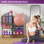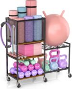 【Sturdy and Durable】The combination of high quality wood and metal increases the sturdiness and durability of this fitness equipment storage rack so that you can store approximately 65 pounds of weight on each shelf. Also, 6 metal wheels add great stability to this yoga rack while on the move.