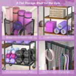 【5 Tier Storage Design】This exercise equipment organizer is made up of two high quality metal mesh shelves and three durable wood board shelves. It can effectively organize yoga mats, dumbbells and other fitness accessories of different sizes to meet your fitness equipment storage needs.