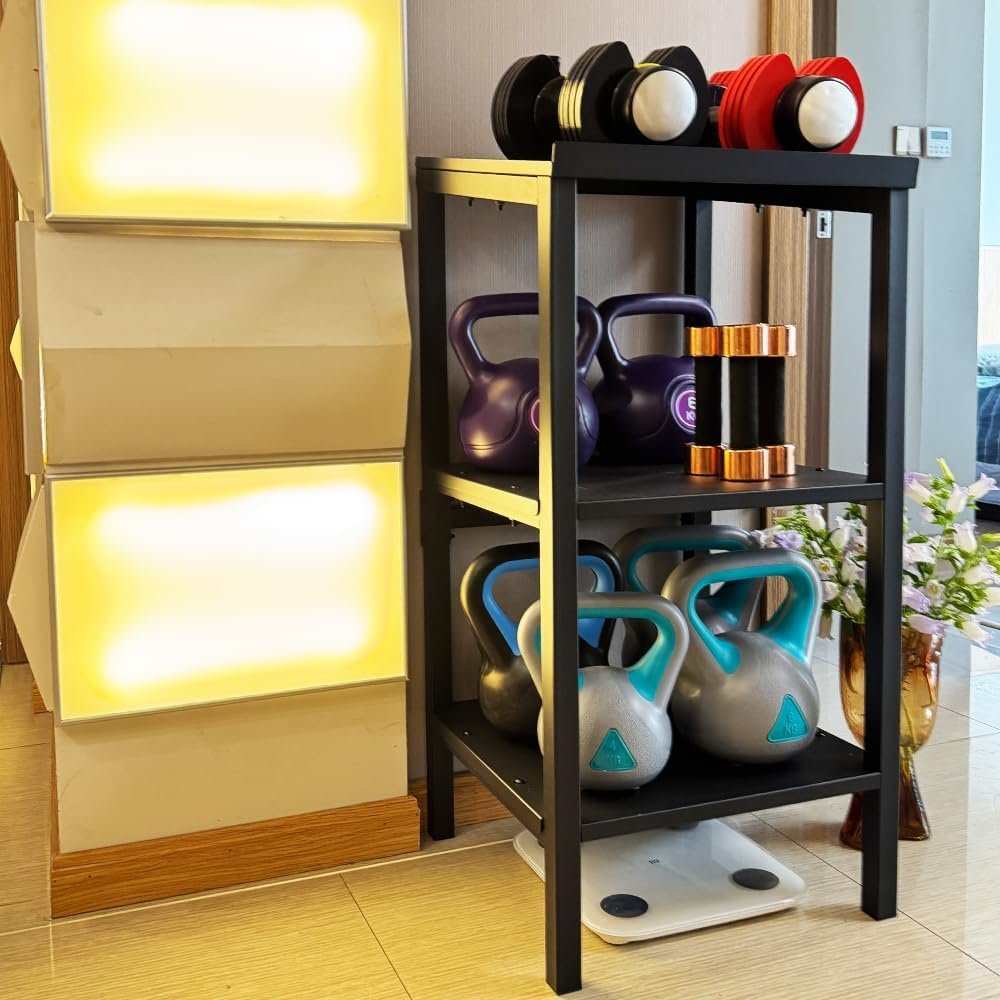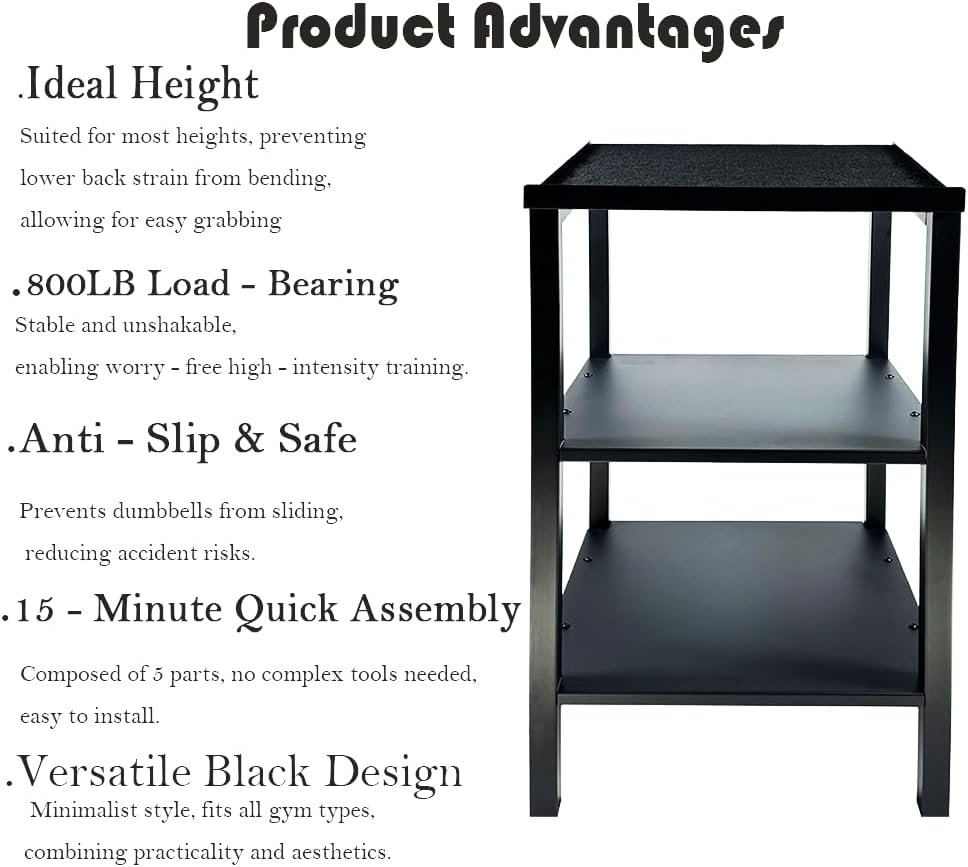 🛒Our advantages lie in: three-tier storage space, dumbbell-shaped shelves. Storage area for fitness equipment, storage area for yoga equipment, inclined display racks, protective pads, structurally stable, with a load-bearing capacity of 800 pounds.