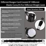 DIFFERENT BUNGEE CORD CONSIST OF DIFFERENT ELASTIC CORES(The thickness of the elastic cores is different):For weight class-1, 50kg,consists of 3 thin elastic cores (Φ12mm),For weight class-2, 60kg,consists of 3 thin cores ( Φ13mm), For weight class-3, 70kg,consist of 2 thin elastic core and 1 thick cores (Φ13mm and Φ15mm),For weight class-4, 80kg,consists of 1 thin elastic core and 2 thick cores (Φ13mm and Φ15mm),For weight class-5, 90kg, consists of 3 thick cores(Φ15mm)