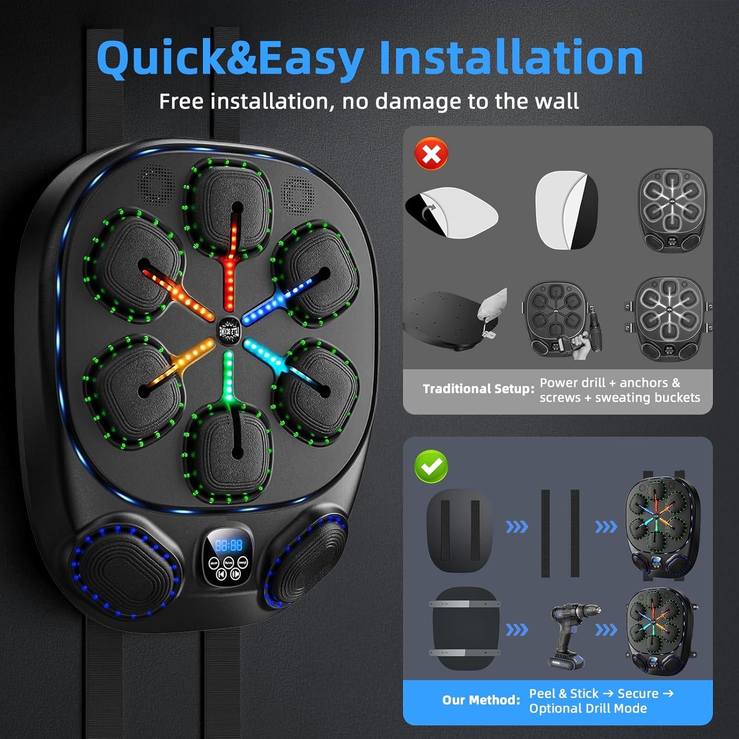 **💡【Dynamic LED Light Show】** Colorful lights sync with your punches and music, creating an immersive workout atmosphere to boost motivation.