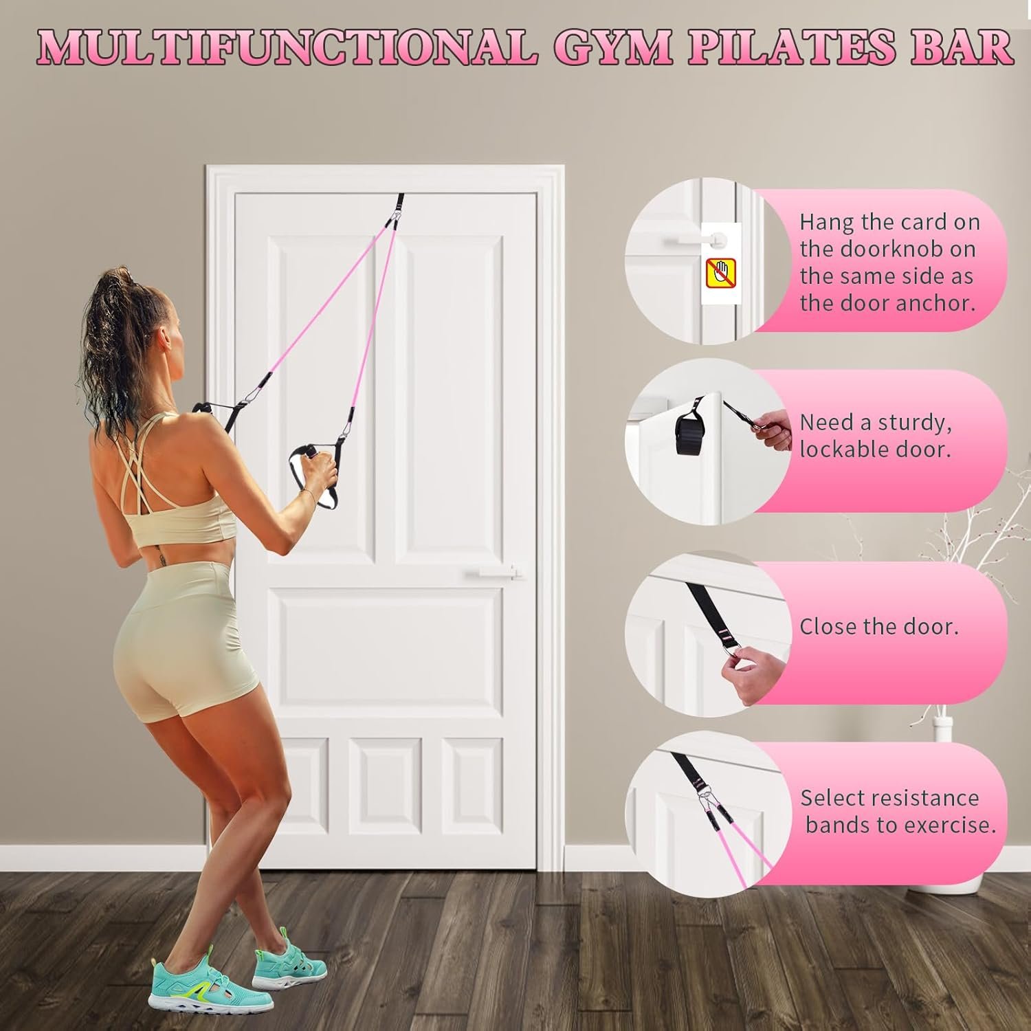 【Multiple Exercise Equipment】 2-in-1 multi-function handle has soft padding to prevent chafing against the skin, Wear-resistant D-buckles on the handles make it easy to change any resistance bands. Door anchor is very useful when you have a lockable, sturdy door. It can be connected with multi-functional handles and resistance bands for exercising arms and back. It can also be combined with ankle straps to exercise your legs.