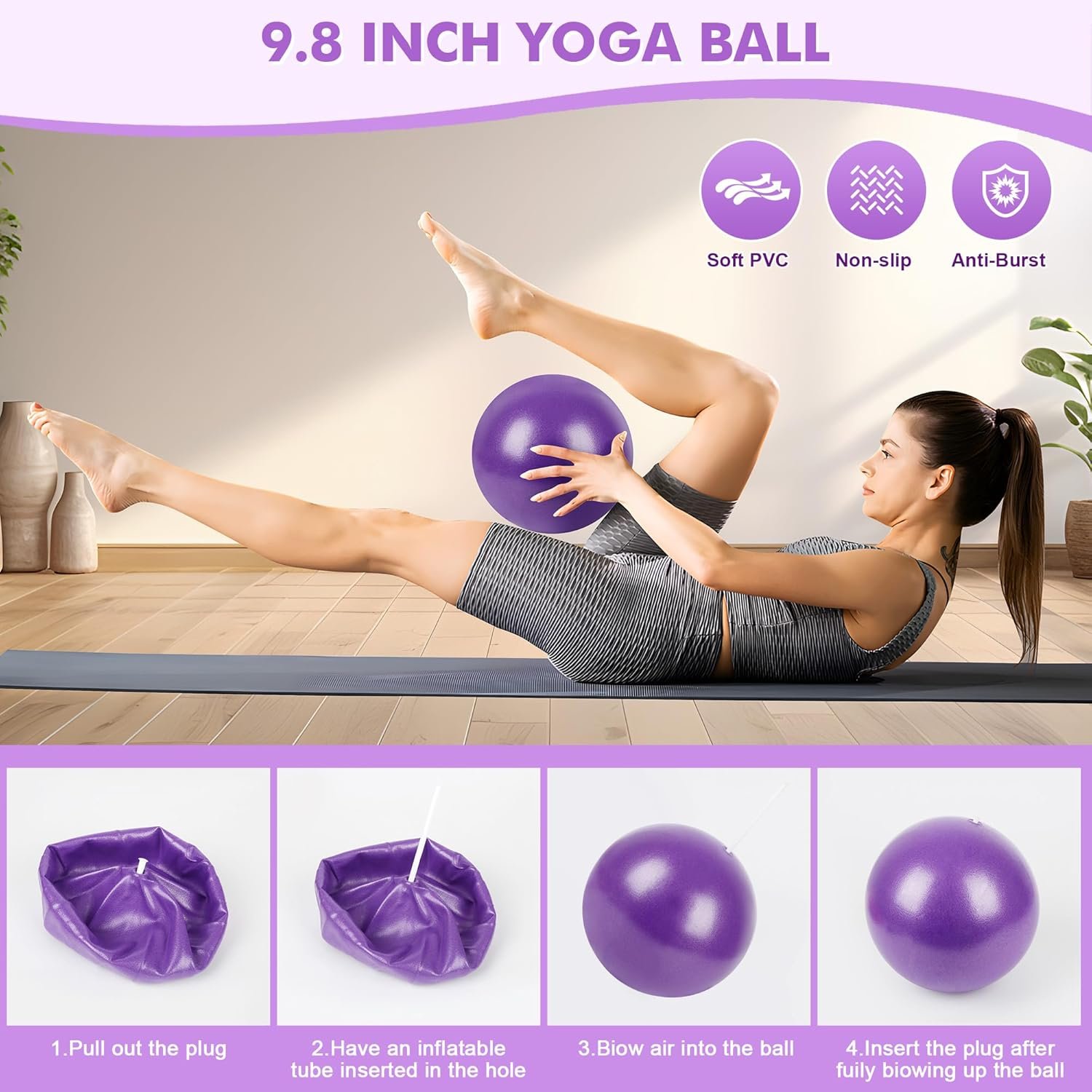 • The soft 9.8-inch Pilates ball is ideal for stability and low-impact practices.
