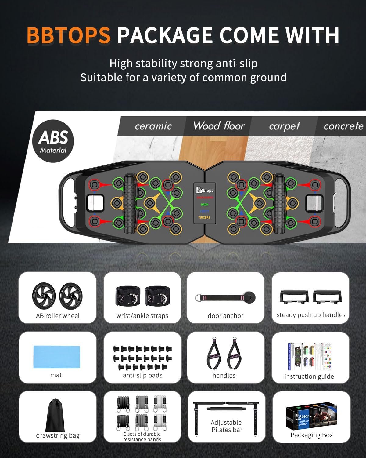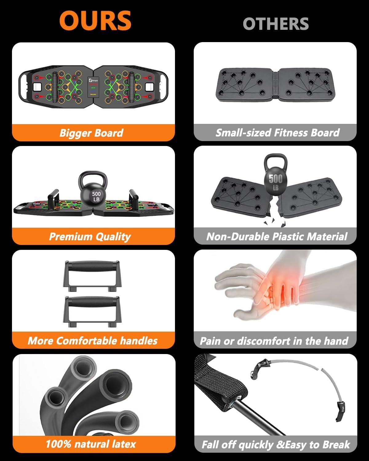 【High Quality Push UP Board】The Bbtops push up board is made from durable ABS plastic, high durability and rigidity and outstanding resistance to impact, abrasion,and can be folded 180 degrees. Withstands weights up to 500 pounds of force.