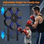 WALL MOUNTED EASY INSTALLATION – This musical boxing machine with gloves is designed to be wall-mounted, requiring no drilling for installation, saving space while being securely fixed to the wall with Velcro straps, ensuring stability and safety during use. Users can also freely adjust the height according to their needs, accommodating users of different heights.
