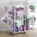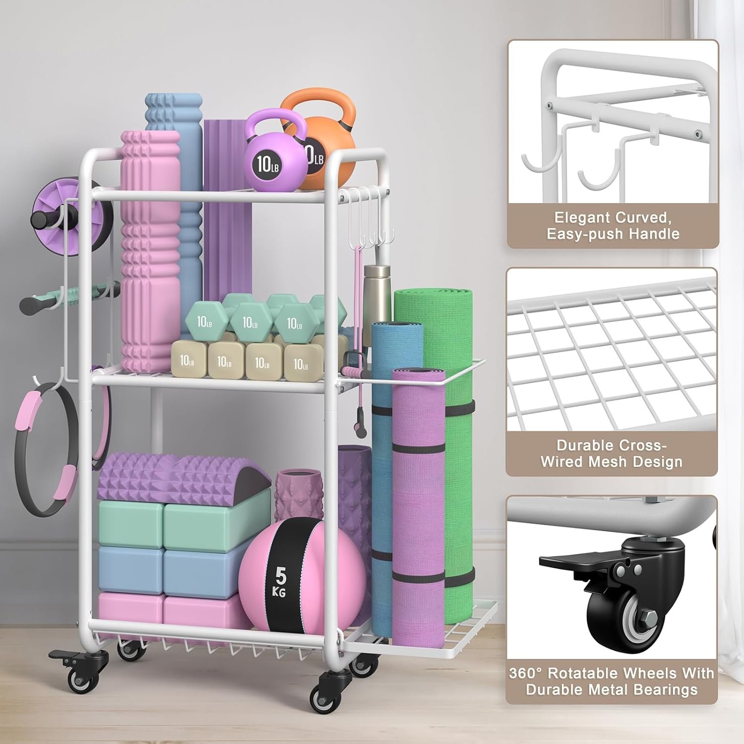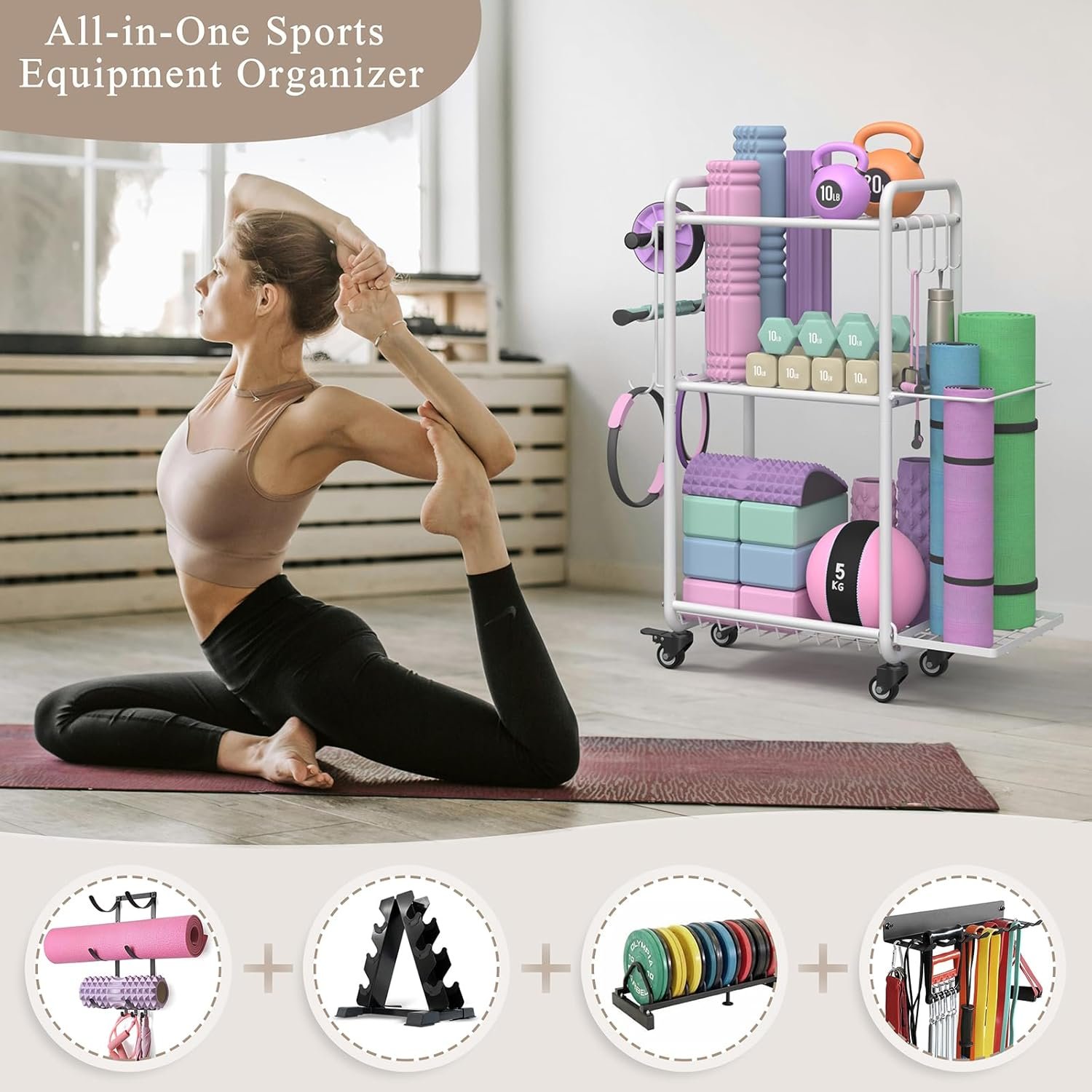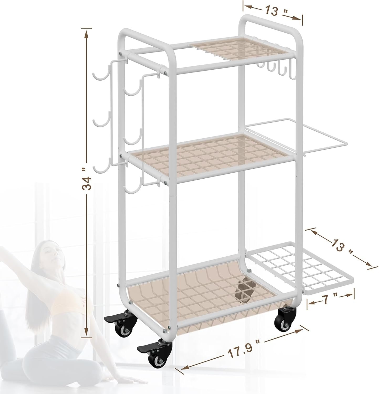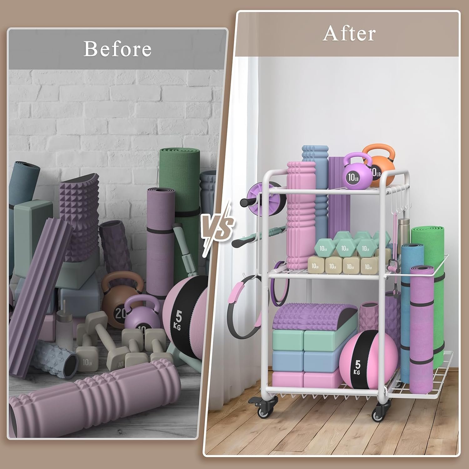 UPGRADED WHEELS & ACCESSORY HOOKS: This fitness equipment organizer comes with 4 smooth-rolling wheels (including 2 locking ones), making it easy to maneuver around your home. Additionally, the integrated, removable hooks on both sides offer extra space for hanging towels, ab rollers, resistance bands, yoga straps, and other home gym essentials